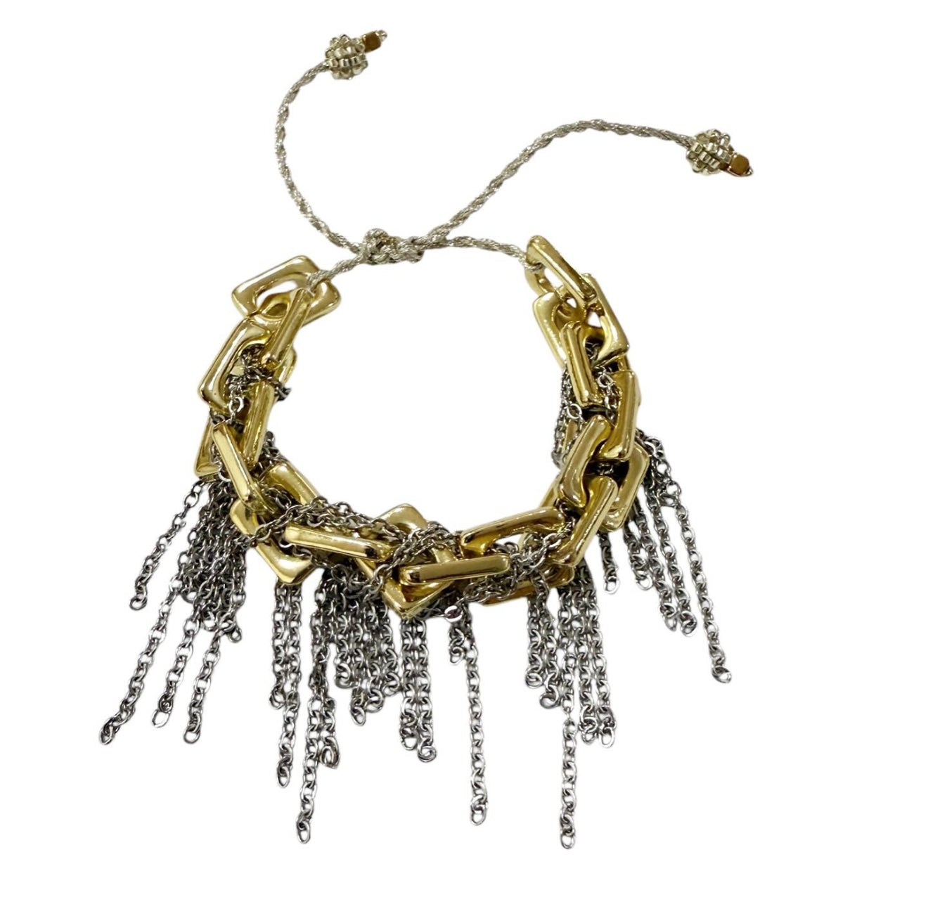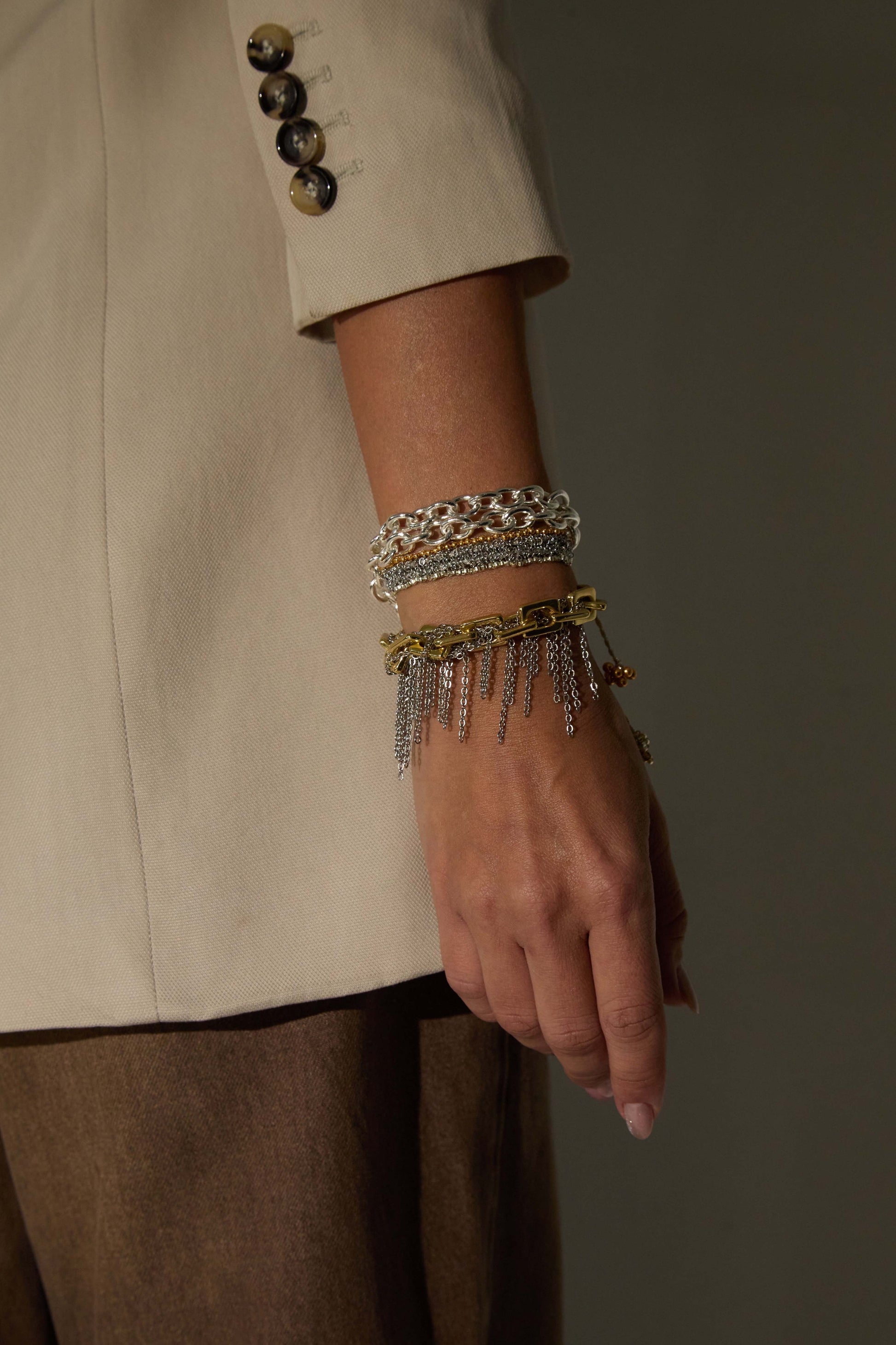 The Claire Bracelet is a delightful bracelet in golden and silver tones. Its unique pull-tie closure design not only adds a stylish touch but also ensures a comfortable and adjustable fit.