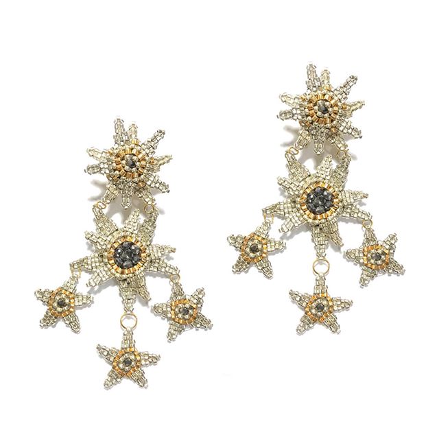 These starburst earrings are handwoven by artisans in Colombia with crystals and glass seed beads on a felt backing with post back closures.