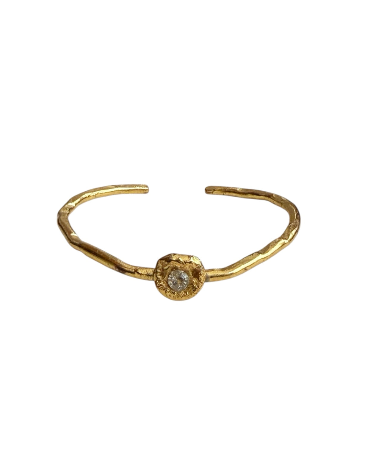 A handcrafted open cuff bracelet in textured gold, designed with an organic, branch-inspired silhouette that feels both raw and refined. At the center, a hand-molded bezel holds a luminous clear stone, creating a soft point of light against the rustic, artisanal finish. Elegant in its simplicity and intentional in its imperfections, this piece brings a natural, timeless beauty to any look