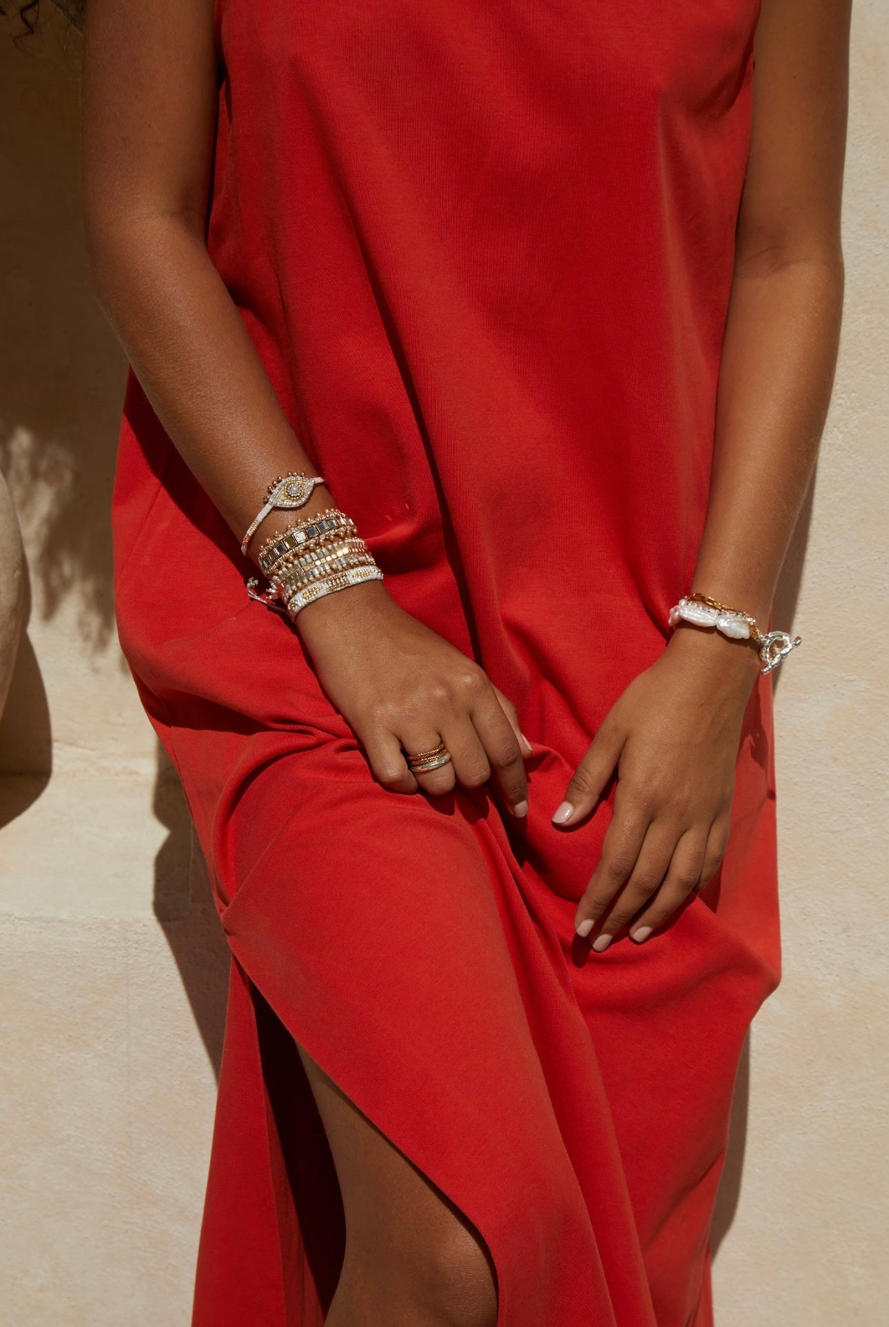 The Solei Bracelet is a mesmerizing masterpiece, boasting a captivating design that combines beads, strass, and a stunning pearl at its center for an enchanting look. This spectacular and luxurious bracelet features a gold-plated clasp, ensuring a perfect and secure fit. With its unique and eye-catching design, the Solei Bracelet is an accessory that exudes elegance and charm, making it a must-have addition to your collection.