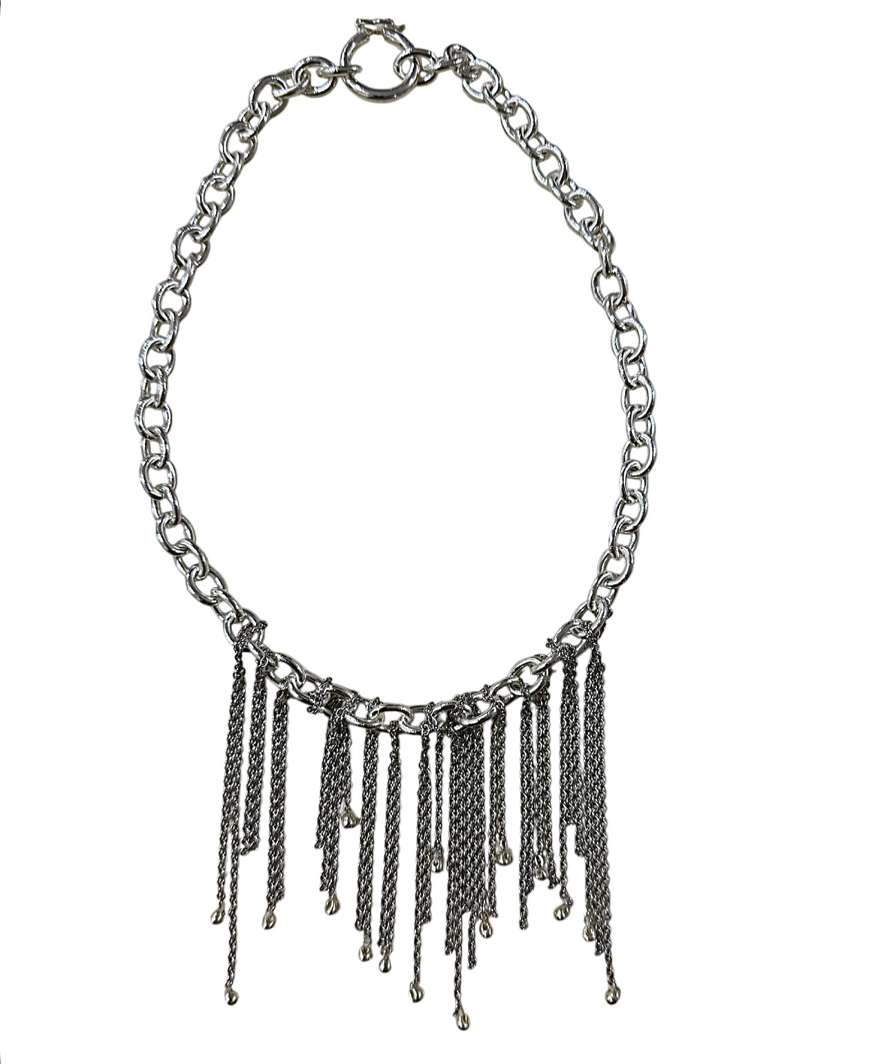 Cascading fringe chains in an oxidized silver finish