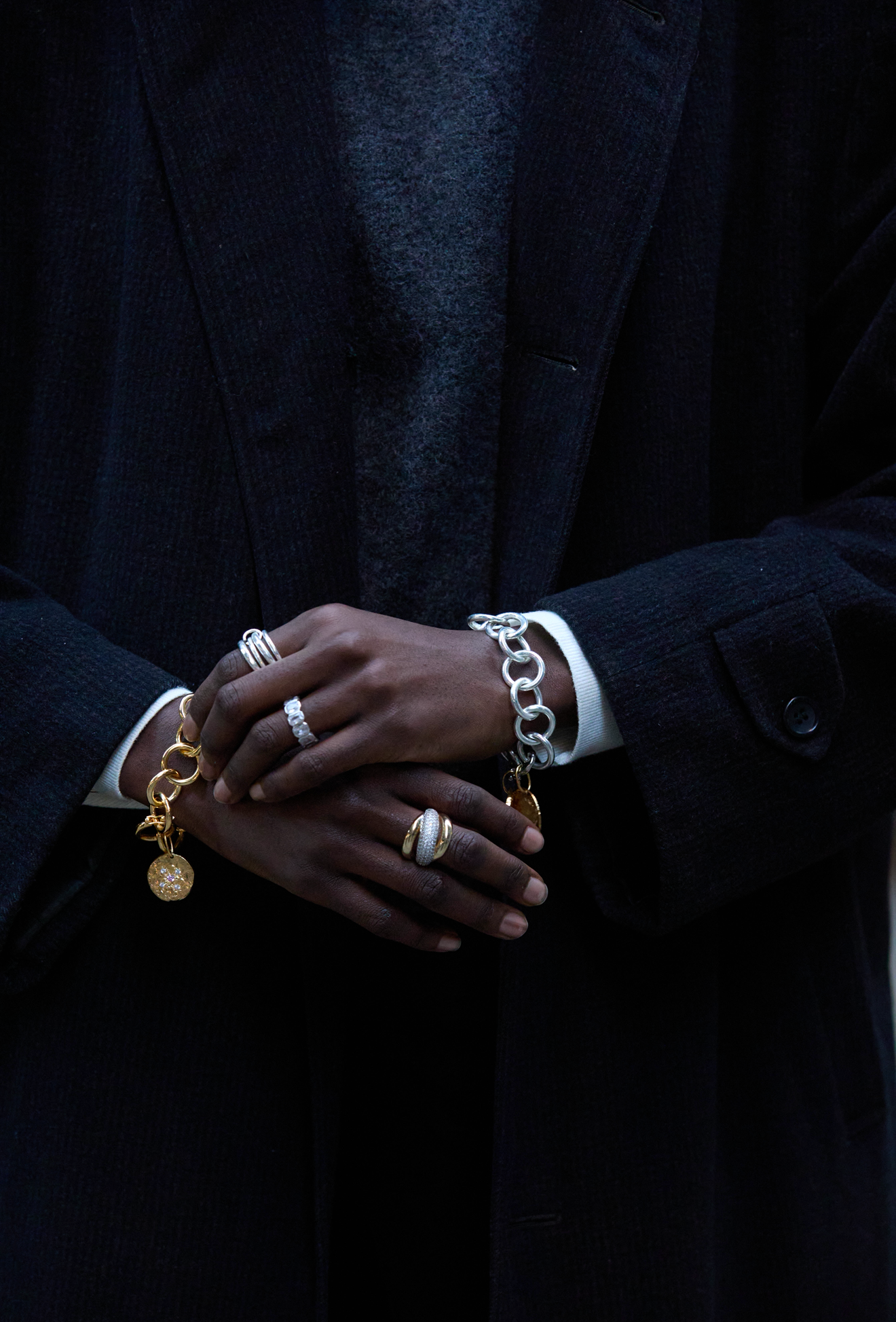 A bold yet refined bracelet crafted from oversized, interlocking gold-plated rings that create a sculptural, fluid silhouette on the wrist. At its center hangs a textured medallion charm—hammered by hand and set with delicate, multicolored stones that catch the light with subtle brilliance. The contrast between the polished links and the organic pendant gives the piece a modern artisanal character, making it a statement accessory that elevates any look with warmth and sophistication.
