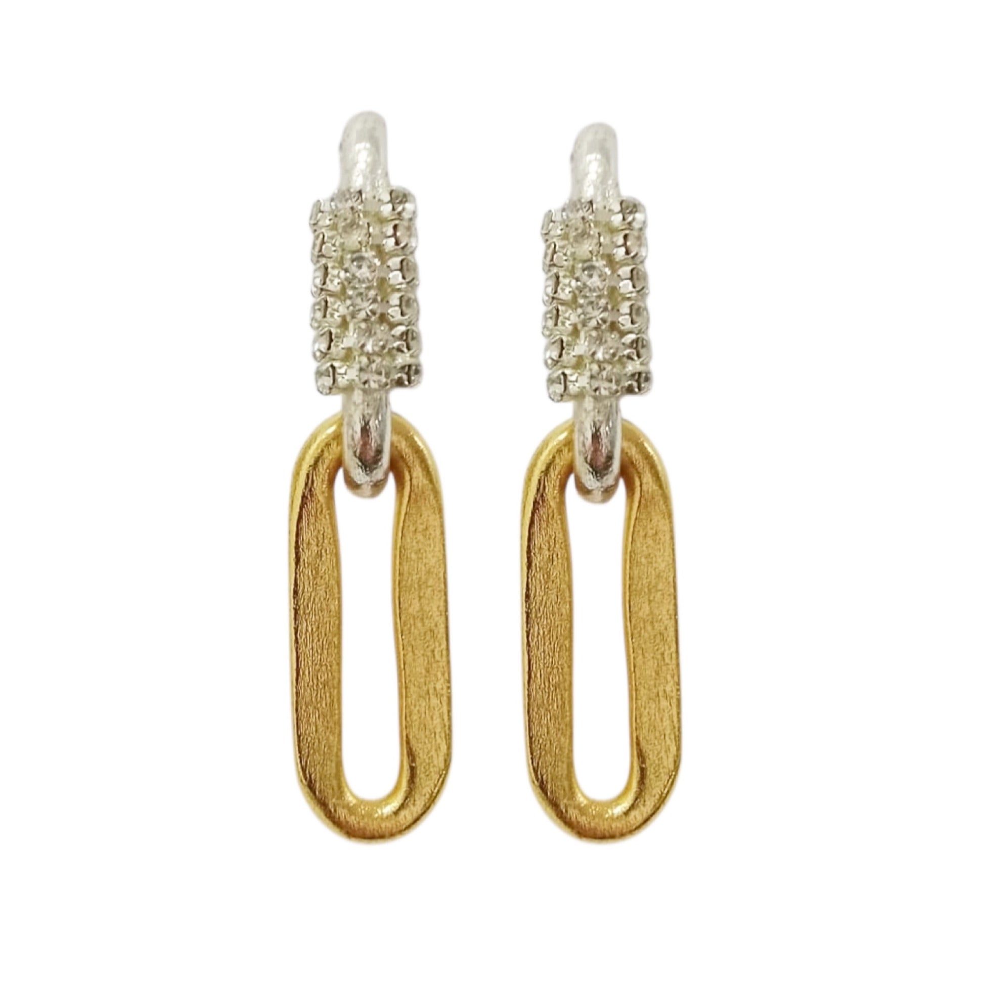 A modern interplay of light and form, the Tempo Earrings feature a sculptural two-tone design: a radiant pavé silver loop paired with an elongated golden link. The contrast of textures and finishes creates a piece that feels both contemporary and timeless.