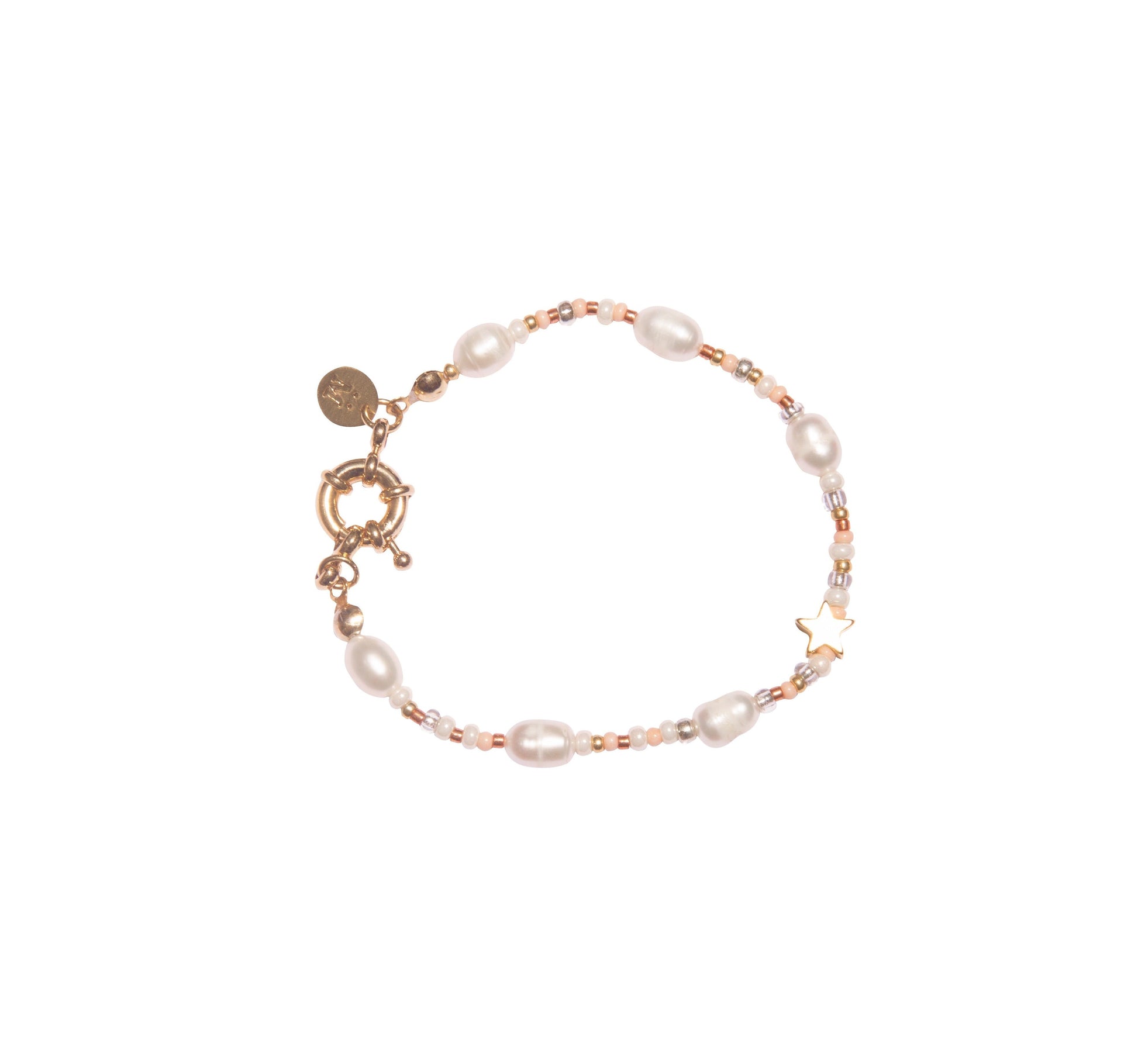 Add a sweet finishing touch with this adorable pearls bracelet featuring a star and astonishing iridescent colors.